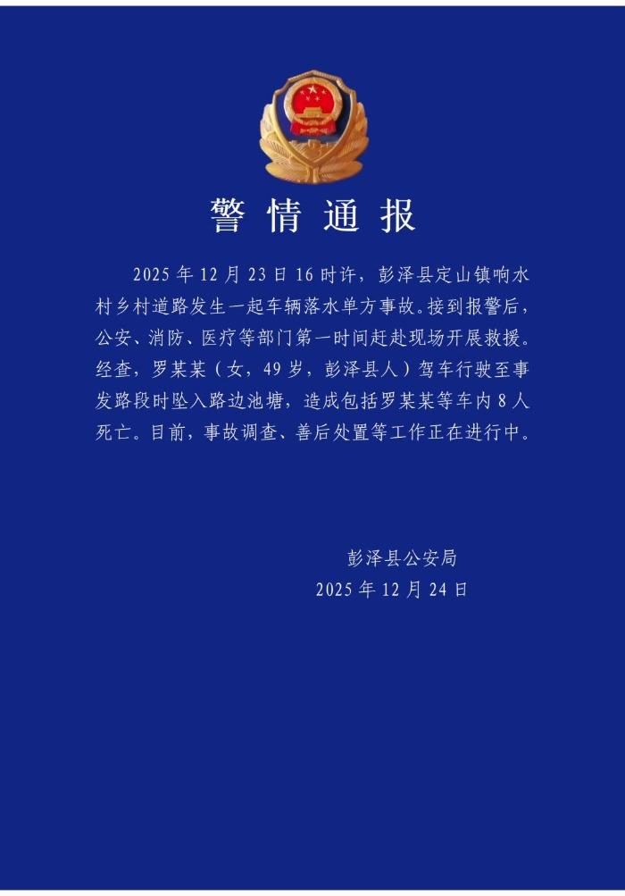 2025年12月23日16时许,彭泽县定山镇响水村乡村道路发生一起车辆落水单方事故。接到报警后,公安、消防、医疗等部门赶赴现场开展救援。经查,罗某某(女,49岁,彭泽县人)驾车行驶至事发路段时坠入路边池塘,造成包括罗某某等车内8人死亡。目前,事故调查、善后处置等工作正在进行中。