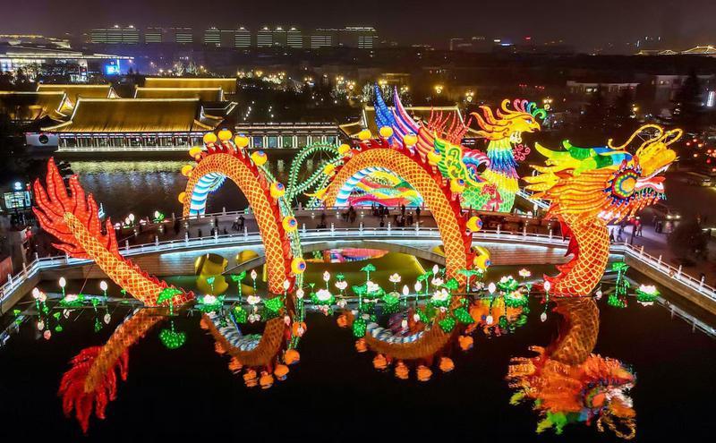从这诗意的迷阵中走出,便踏入了“国花盛放”的牡丹长廊。百株牡丹灯沿阶绽放,其灵感源自唐代仕女的风华,灯光随脚步明灭,营造出“步步生辉”的华美意境。而视线越过繁花,芙蓉湖面上横卧着长达七十米的“水域华章·龙凤呈祥”灯组。巨龙与彩凤镂空的灯羽间光华流转,如同星河倾泻水面,它们不仅是视觉的奇观,更被赋予“大唐主理人”的生动角色,在特定时刻以光影演绎祥瑞降临的传说。