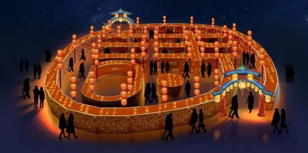 最令人惊叹的“九曲黄河阵”诗词迷宫,从高空俯瞰竟是由百余首唐诗名句构成的巨型文字矩阵。红金相间的灯墙在夜色中闪烁,游人身处其间,转角遇见李白的豪放、王维的诗画图景,一步一诗,恍若穿越时空与诗人们并肩同行。“我们想让唐诗‘活’过来,让诗句在光影中呼吸。”