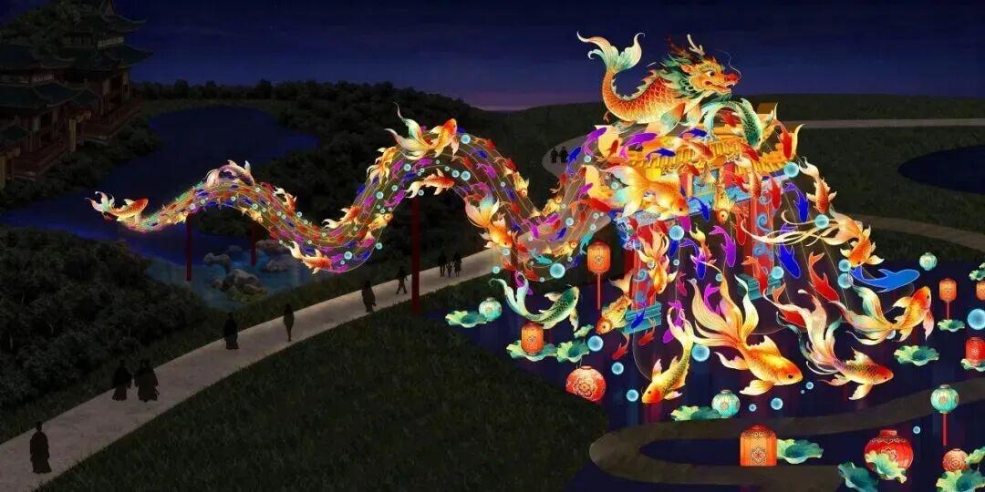 与水中静谧的祥瑞相呼应的,是陆地上奔腾的豪情。“唐灯驰春·骏马奔腾”灯组以古画为蓝本,融合剪纸艺术与数控灯光,让八匹骏马呈现出鬃毛飞扬、破屏而出的动态气势,瞬间点燃“春风得意马蹄疾”的盛唐情怀。目光转向近处的水面,“锦鲤跃波”则带来另一番灵动趣味。数百尾感应锦鲤灯随人聚散,鳞光与倒影交织成梦幻光海,寓示着年年有余的美好祈愿。