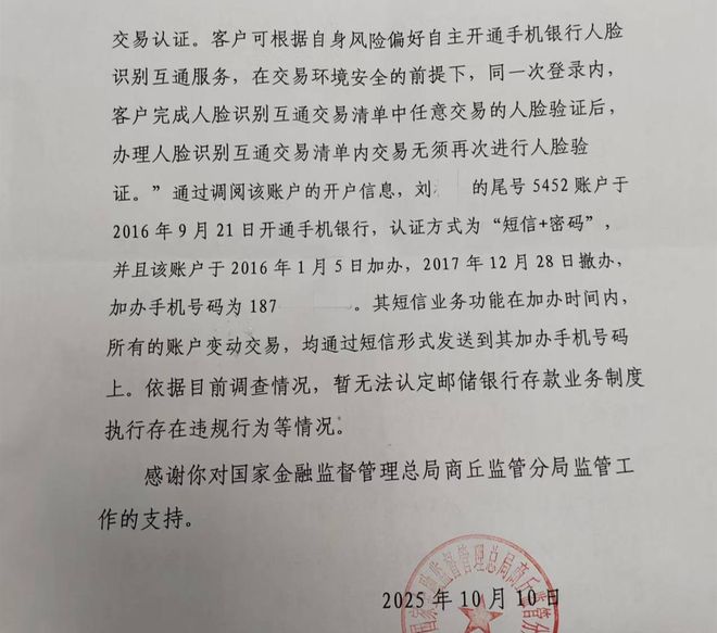 事发后,商丘金融监管分局今年10月10日通过“群众答复意见书”回复一位刘姓储户称:依据目前调查情况,暂无法认定邮储银行存款业务制度执行存在违规行为等情况。
