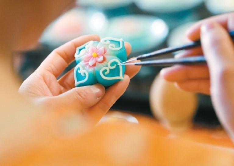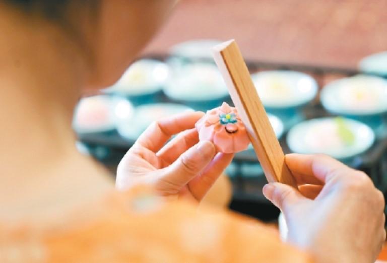 用工具轻轻压制唐果子边缘,精巧的造型栩栩如生。