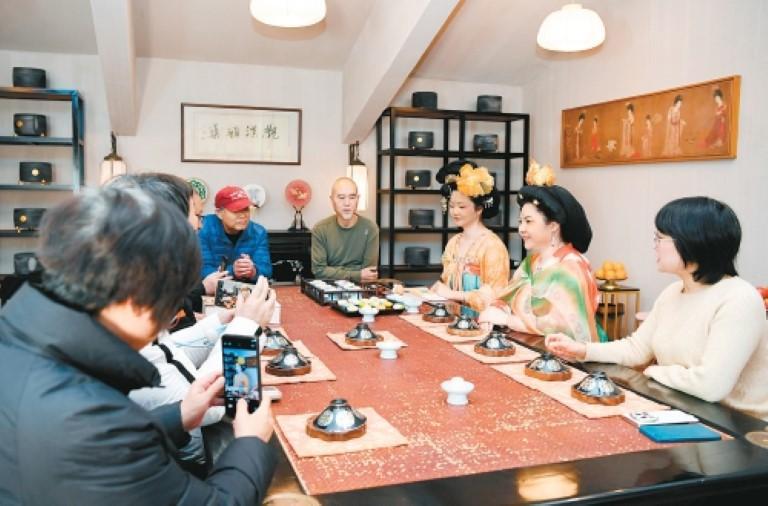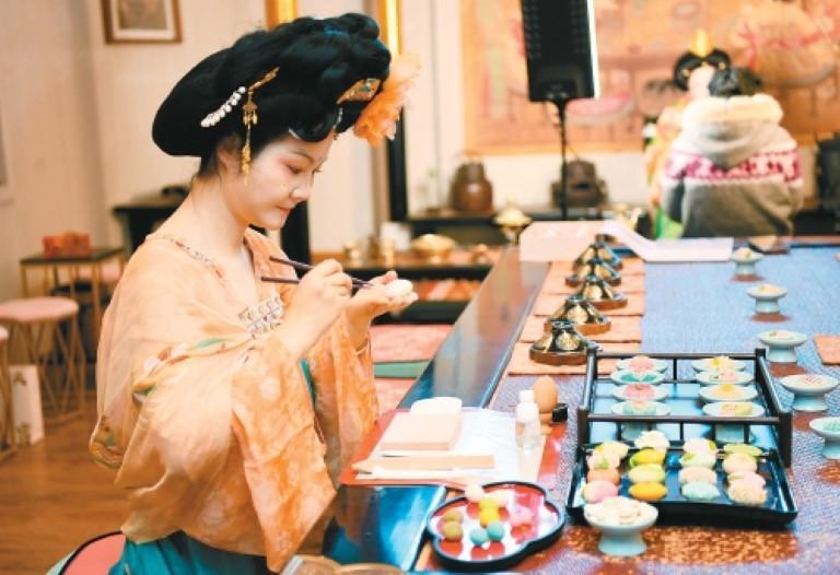 怀揣着发扬传统文化的初心,李欢团队始终致力于让唐果子、唐茶走出古籍与茶席,融入当代日常。每逢进博会、旅博会等重大活动,李欢都会和团队成员身着唐制汉服、化上唐代复原妆盛装出席,以沉浸式的形象演绎,为唐果子与唐茶文化的推广增添古韵风采。团队推出的唐果子制作体验项目,更是吸引了众多游客和留学生参与,当大家亲手将一团豆泥揉、捏、挑、压,塑造成精巧的花鸟纹样时,历史与当下的距离便被悄然拉近。此外,团队还让唐果子化身办公桌上的午后清供、露营时的山水雅趣,甚至与意式咖啡巧妙搭配,打破场景与文化的边界。