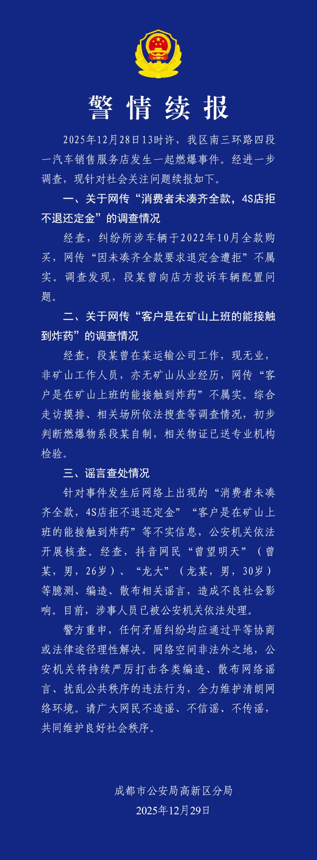 12月29日,成都高新警方再通报“4S店外燃爆事故”,初步判断燃爆物系自制,另外针对谣言,已查处2名造谣者。据警方此前通报,该事故已造成1死4伤。以下为全文: