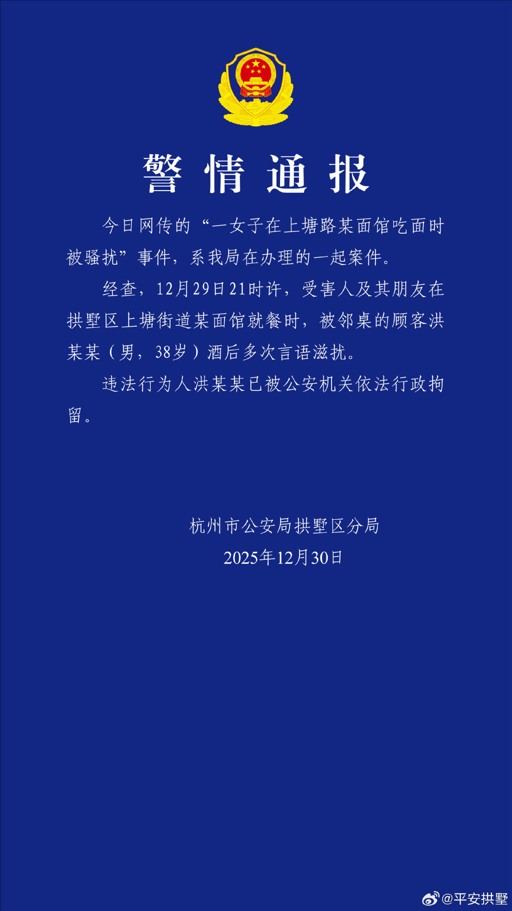 杭州警方通报“女子就餐时被言语骚扰”:涉事男子被行拘