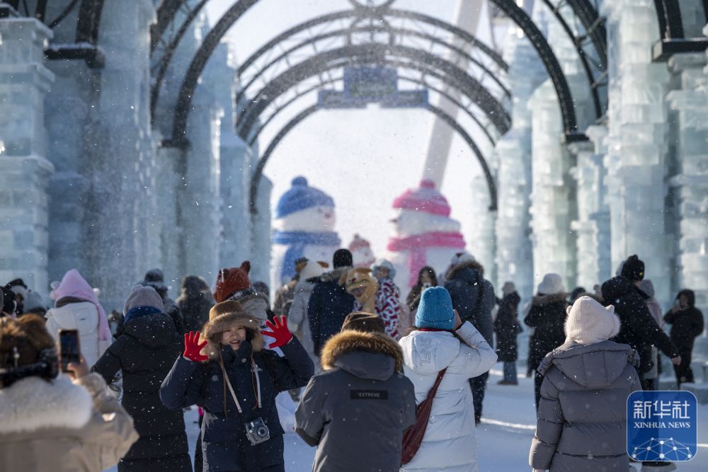 ↑ 1月2日,人们在哈尔滨冰雪大世界园区拍照。新华社记者 张涛 摄