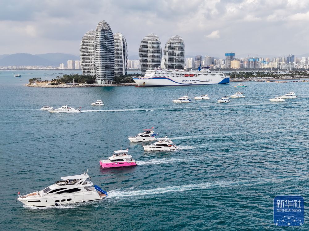 ↑ 1月1日在海南三亚凤凰岛海域拍摄的出海游艇(无人机照片)。新华社发(叶龙斌摄)