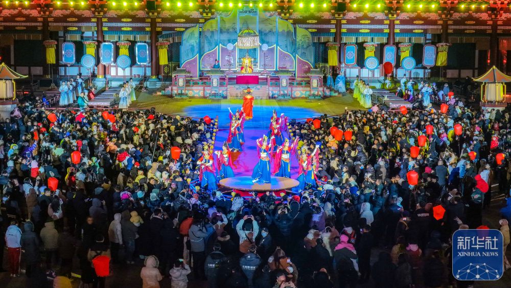 ↑ 1月1日,游客在山东乐陵影视城景区观看表演(无人机照片)。新华社发(贾鹏 摄)