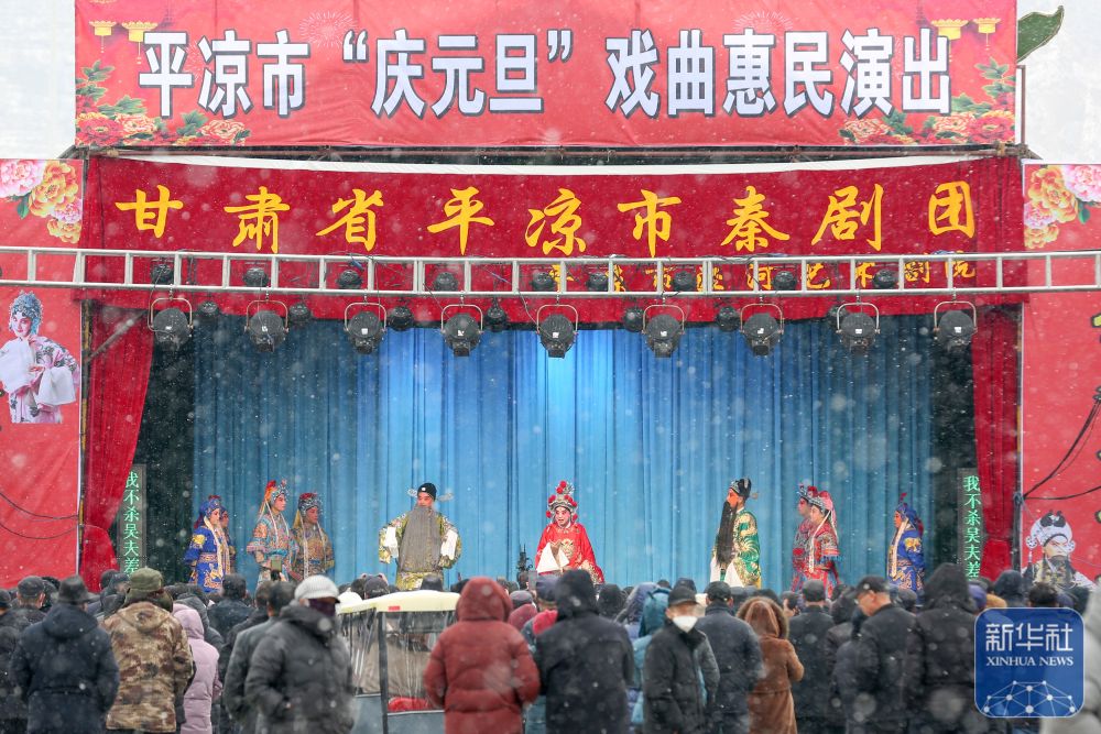 ↑ 1月2日,在甘肃省平凉市崆峒区,人们冒雪观看戏曲惠民演出。新华社发(吴希会摄)