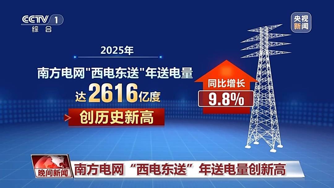 记者4日从南方电网了解到,2025年,南方电网西电东送年送电量达2616亿度,同比增长9.8%,创历史新高。在粤港澳大湾区,数字经济、先进制造等产业蓬勃发展,用电需求刚性增长,带动广东成为全国首个用电负荷突破1.6亿千瓦的省份。