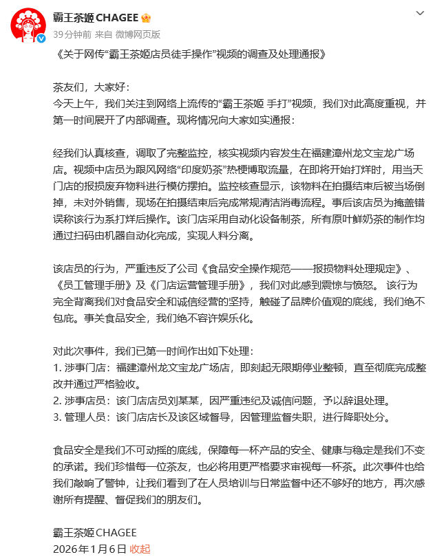 1月6日,@霸王茶姬CHAGEE 发布关于《网传“霸王茶姬店员徒手操作”视频的调查及处理通报》。