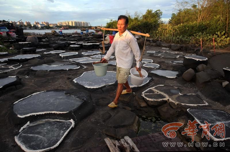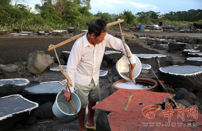 对收集到储卤池中的卤水,还要进行浓度检验。卤水盐份检验的方法,是摘下盐田旁灌木上的一片树叶,掐一小截,丢进卤水池里,如果沉下去了,表明盐浓度还不够;叶茎若是漂浮起来,表明卤水浓度较大,符合晒盐的要求。盐度合适了,就进入晒卤水工序。盐工将卤水从池中担运到大缸内,然后从大缸舀出,倒在一个个石槽内,大太阳足足晒上一天,傍晚就可收获留在石槽上的、白花花的“海盐”。