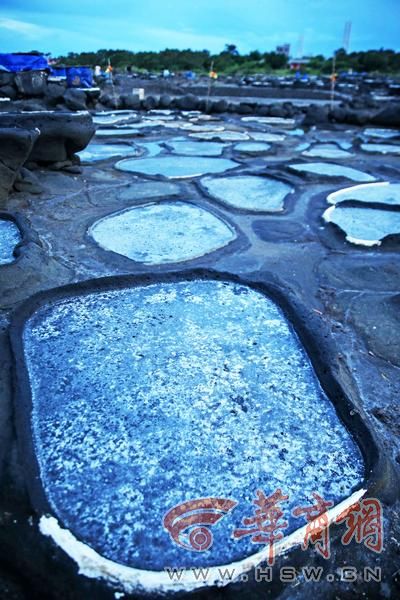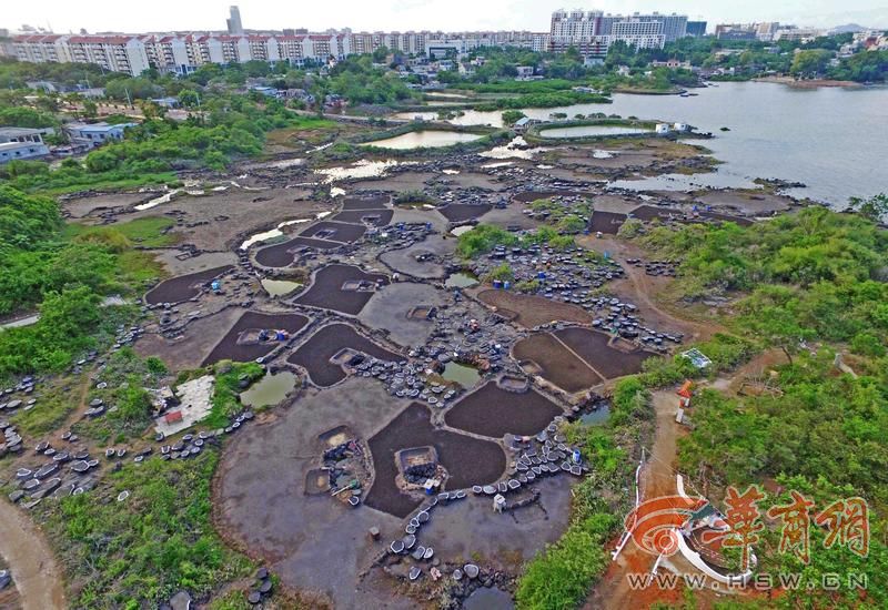 盐田村现今保存了750多亩的盐田,7300多个石槽,晒盐泥地、盐泥池、盐卤水池各约八九十个,蓄海水池约六七十个。