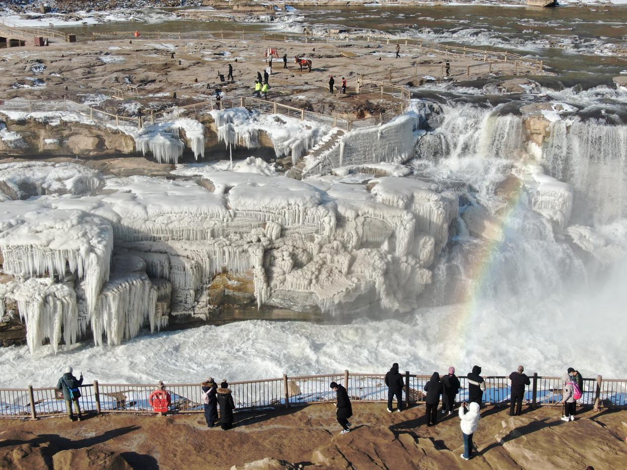 1月6日,游客在山西吉县黄河壶口瀑布景区欣赏“冰瀑玉壶”和彩虹景观(无人机照片)。新华社发(吕桂明摄)