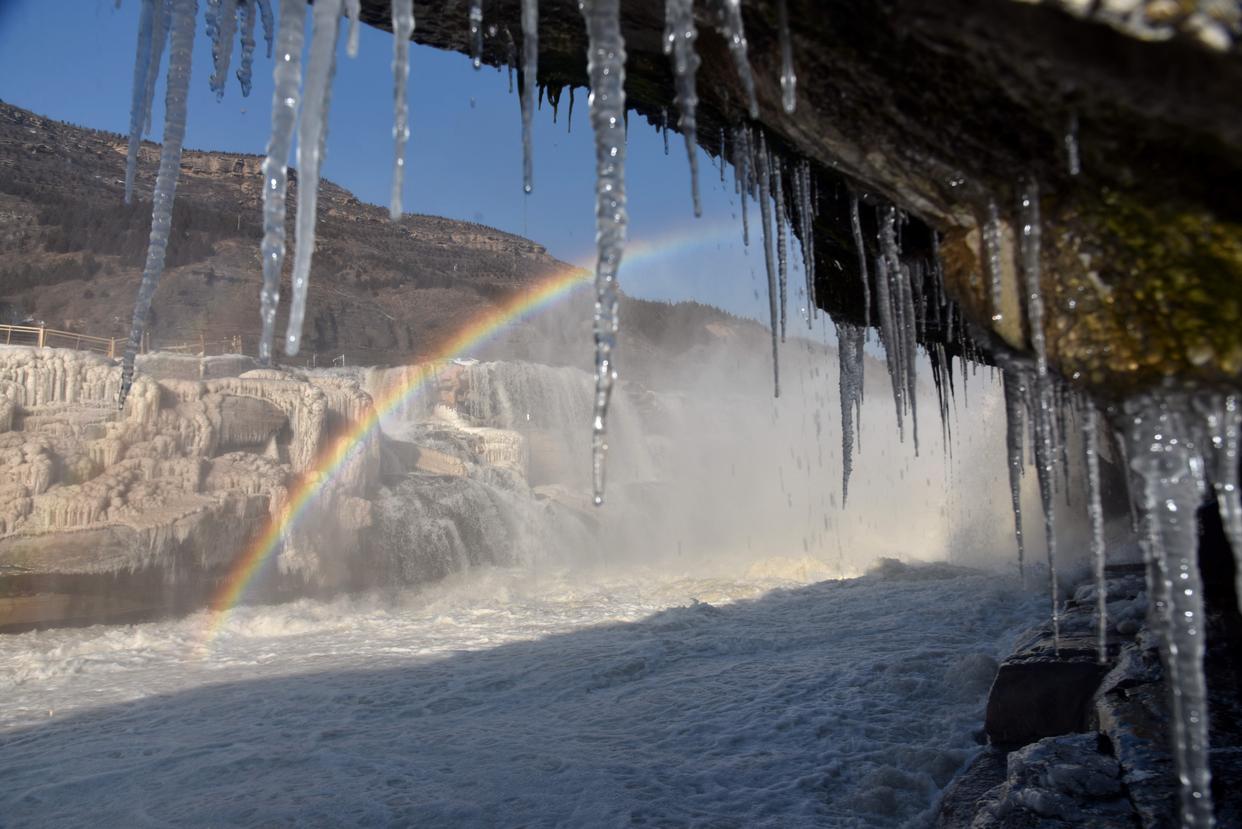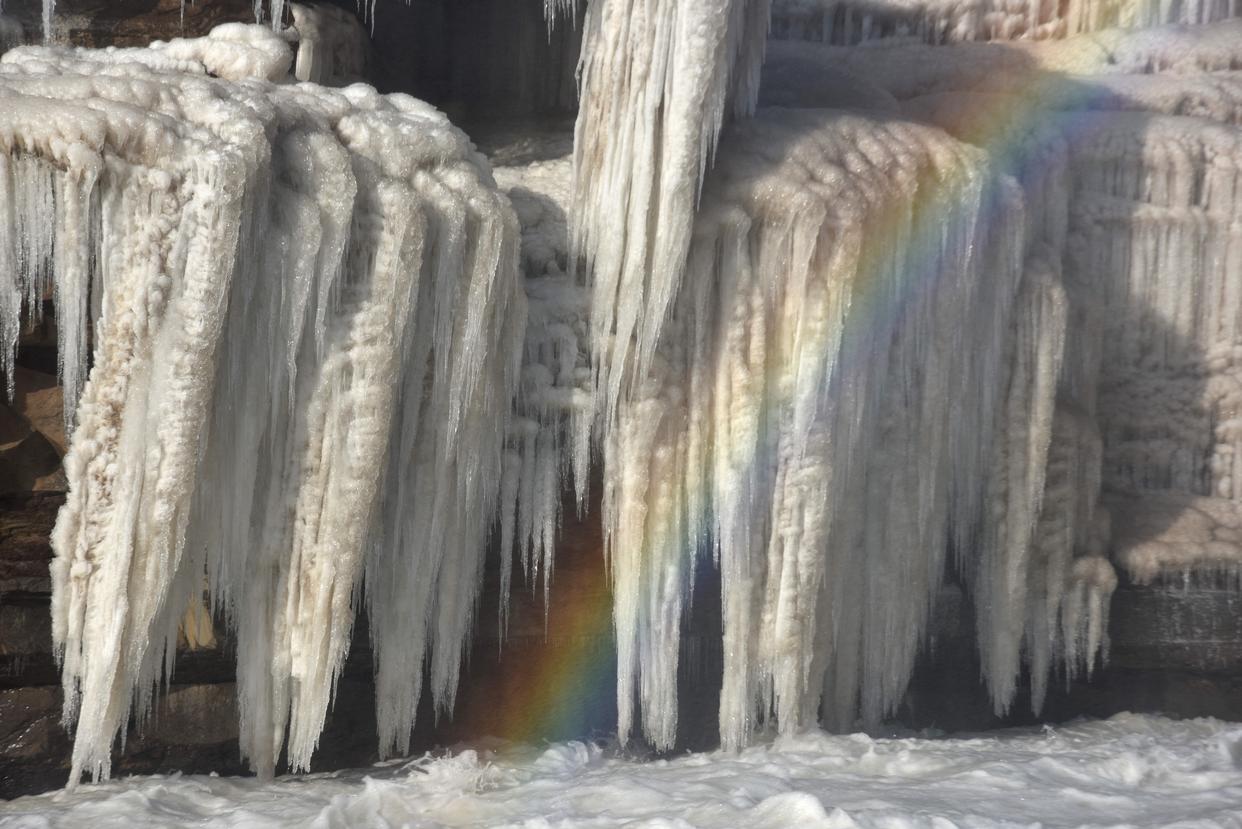 受持续降温天气影响,位于山西吉县和陕西宜川县交界的黄河壶口瀑布形成“冰瀑玉壶”壮美景观,层层叠叠的冰瀑与瀑布上空的彩虹相映成趣,美不胜收。