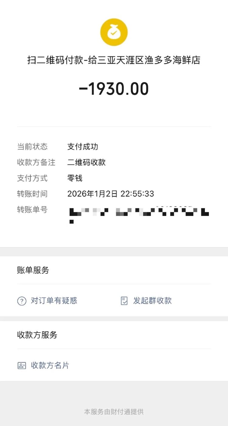 另一网友张先生(化姓)发帖称,带孩子来三亚玩的第二天,便被海鲜店宰客。他在帖文中表示,1月3日,他们从蜈支洲岛乘坐出租车去一家饭店吃饭,途中司机热情地与他们搭话,表示这家饭店的评价都是刷的,最终将他们拉到海棠湾一家海鲜餐厅。