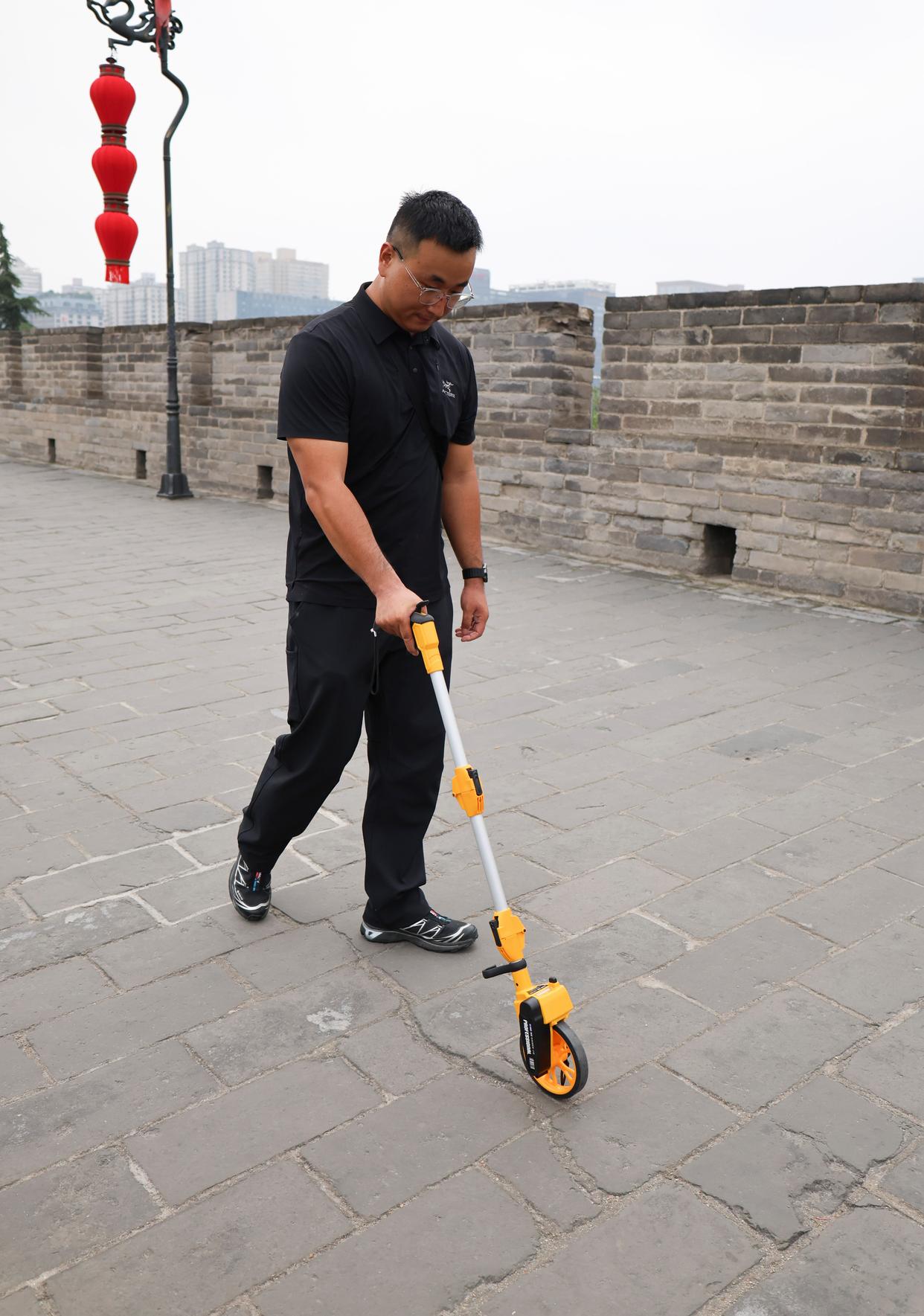 文保巡查员在西安城墙上测量海墁裂缝长度(2025年9月10日摄)。新华社记者 朱唯希 摄