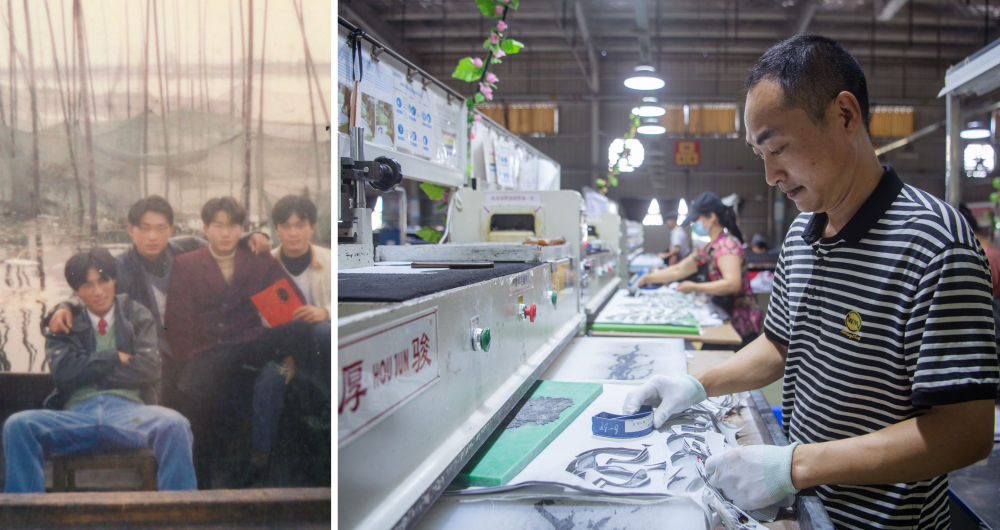 拼版照片:左图为1998年,湖北洪湖渔民陈玉祥(左一)与朋友在船上(资料照片);右图为2023年7月21日,陈玉祥在湖北洪湖一家鞋业公司工作(新华社记者 伍志尊 摄)。陈玉祥曾经在洪湖里整日与渔网、船桨为伴,住船屋、守围网、养螃蟹、捕鱼虾。2017年,陈玉祥一家响应号召上岸,他用购房补贴、扶贫搬迁补偿和政府收购渔船的钱购置了住房,告别了在船屋上风吹雨淋的生活。后来在当地政府的帮助下,陈玉祥接受职业培训后到一家鞋业公司工作。新华社发