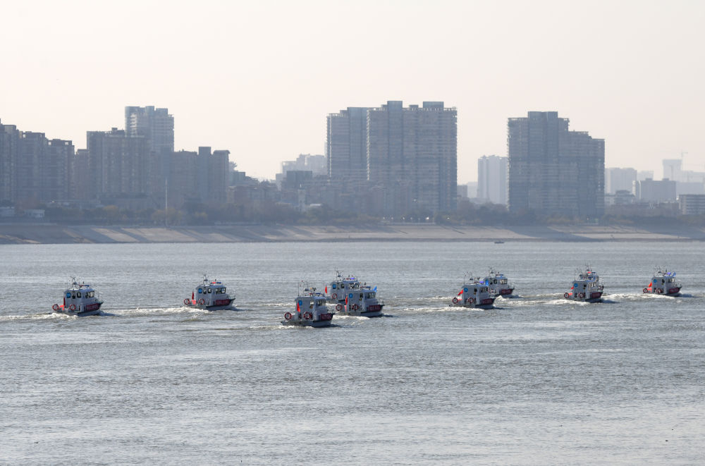2020年12月31日,渔政执法船队从长江武汉段江面驶过。新华社记者 程敏 摄