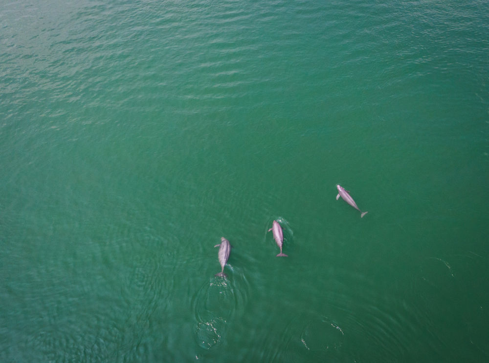 在湖北省宜昌市,长江江豚在水中嬉戏(2021年5月11日摄,无人机照片)。新华社记者 肖艺九 摄