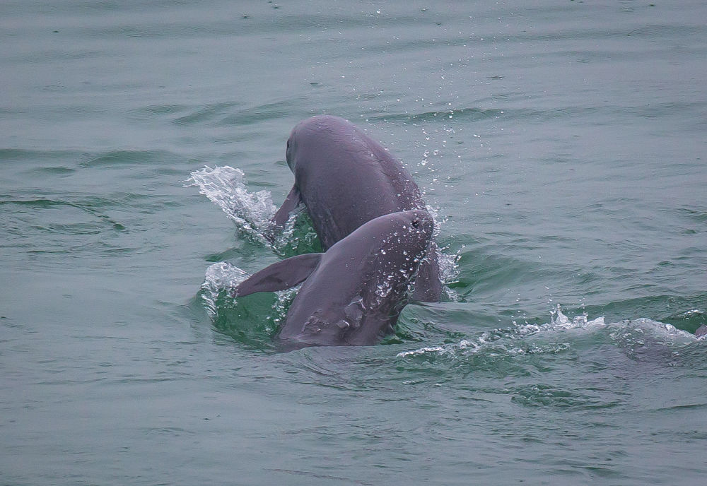 在湖北省宜昌市江边,长江江豚在水中嬉戏(2021年5月10日摄)。新华社记者 肖艺九 摄