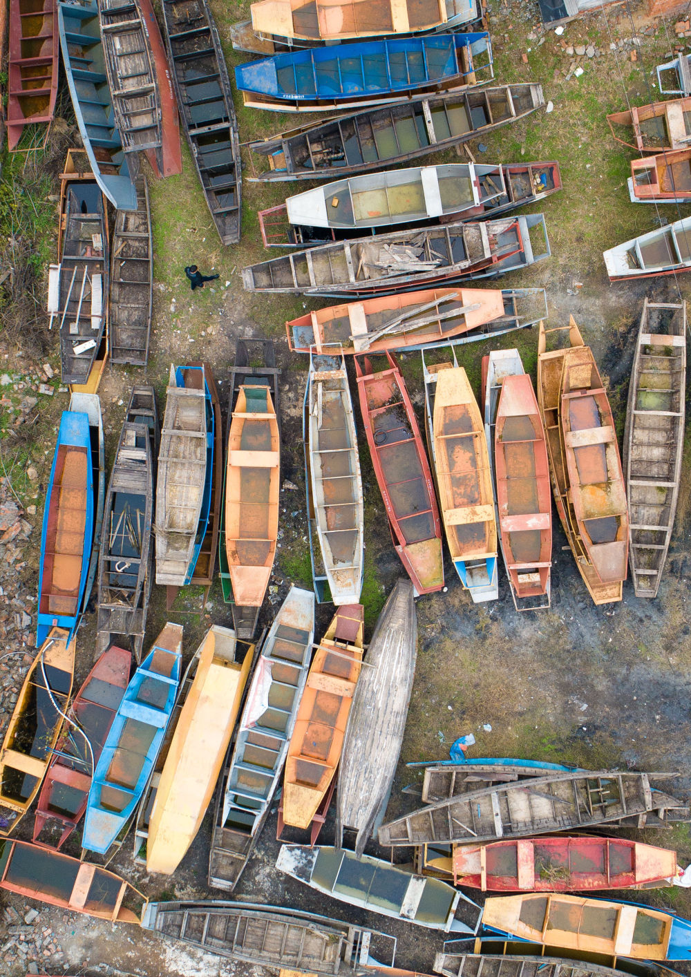 2020年1月2日拍摄的湖北省宜都市枝城镇白水港村一处“上岸”的渔船堆放点(无人机照片)。新华社记者 肖艺九 摄