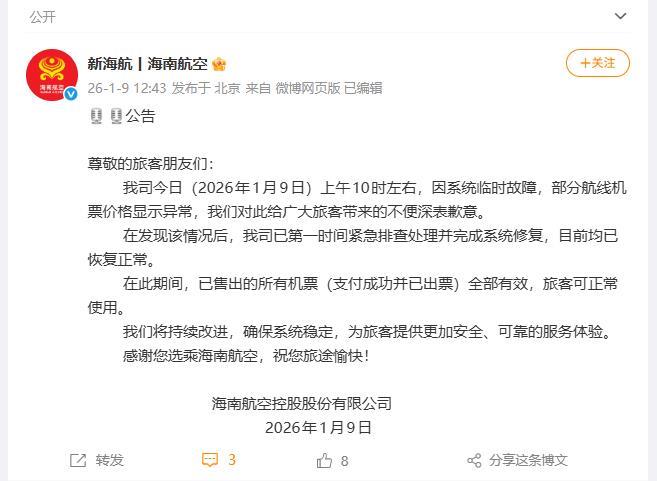 9日12时43分,海南航空发布公告称,9日上午10时左右,因系统临时故障,部分航线机票价格显示异常,对此给广大旅客带来的不便深表歉意。公司已第一时间紧急排查处理并完成系统修复,目前均已恢复正常。在此期间,已售出的所有机票(支付成功并已出票)全部有效,旅客可正常使用。