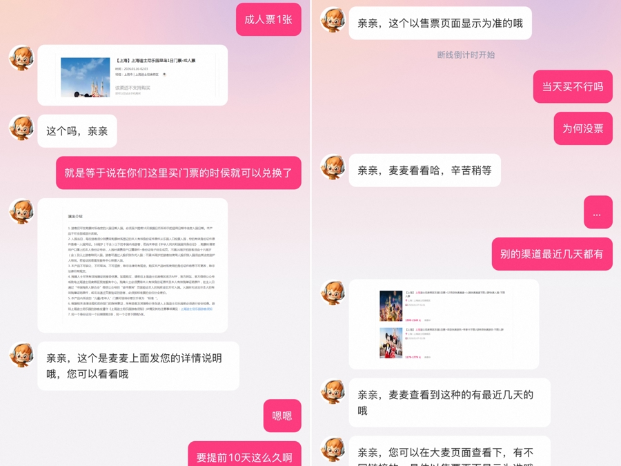 实际上,记者发现,大麦平台“上海迪士尼乐园”的购票专区并非只有早鸟票,常规的“一日票”位于门票列表中,需要消费者点击“一日票”一栏,才会显示“可订今日”的蓝色小字标识,价格也仅比早鸟票贵20几元。显然,大麦平台的人工客服难以第一时间给予消费者有效的购票信息。因此,消费者在购买含有“上海迪士尼乐园+”标题的组合产品时要特别留意,尤其是在跨年等特殊日期,票源紧张的情况下,要再三确认平台能否提供计划入园日期的门票,而不是买完代金券套餐后再去确认。