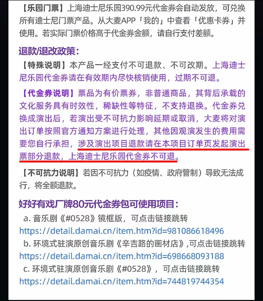 记者发现,在江先生购票时的详情页开头,该产品就提到了套餐内容包含2张演出代金券和1张迪士尼门票代金券。演出代金券3天内有效,乐园门票代金券有效期到2026年3月31日,仅用于抵扣大麦在售的迪士尼门票费用。后续进一步说明,代金券金额为390.99元,演出票可部分退款,乐园门票代金券不可退。