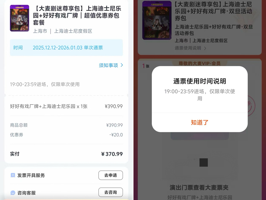 去年12月30日晚间,市民江先生在看到大麦App推送的“上海迪士尼乐园+好好有戏厂牌”的活动广告。想到可以借此庆祝跨年,又是较为优惠的价格,他在没有仔细阅读购买详情情况下,果断支付了742元,购买了2份套餐。当时支付界面大字粗体强调“迪士尼乐园”以及“2025.12.12-2026.01.03单次通票”字样,显示了他们带有个人身份证信息的票夹,令他误以为已成功购买了乐园门票。
