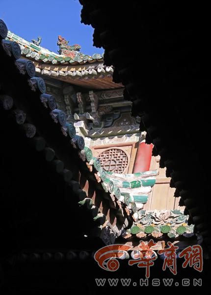 中轴线西侧的戏楼最是精巧,背面重檐歇山、正面单檐歇山的独特形制,在古建筑中实属罕见。檐下斗拱七踩单翘双昂,耍头雕刻成栩栩如生的龙头,额枋上“二十四孝”木雕连环画,刀工细腻,故事鲜活,既显教化之意,又尽展关中木雕的精湛。