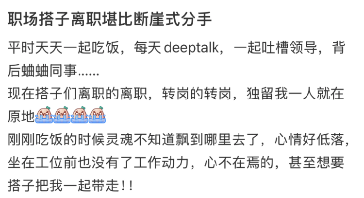 其实,任何一个初始阶段,总归都有“童年”的影子,有所怀念也正常。不过当对初代同事的怀念,成为了年轻人集体的呼声时,它指向的或许并不只是情绪本身,而是一种更深层的职场期待——年轻人希望在高度制度化的工作环境中,仍能保留相当限度的信任、善意与真实连接。