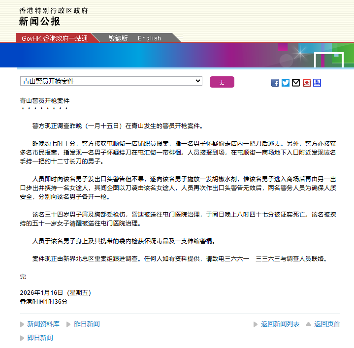 1月15日晚上7时许,一名约30至40岁男子在屯门大会堂附近持刀挟持人质,有警察连开两枪击毙持刀男子。