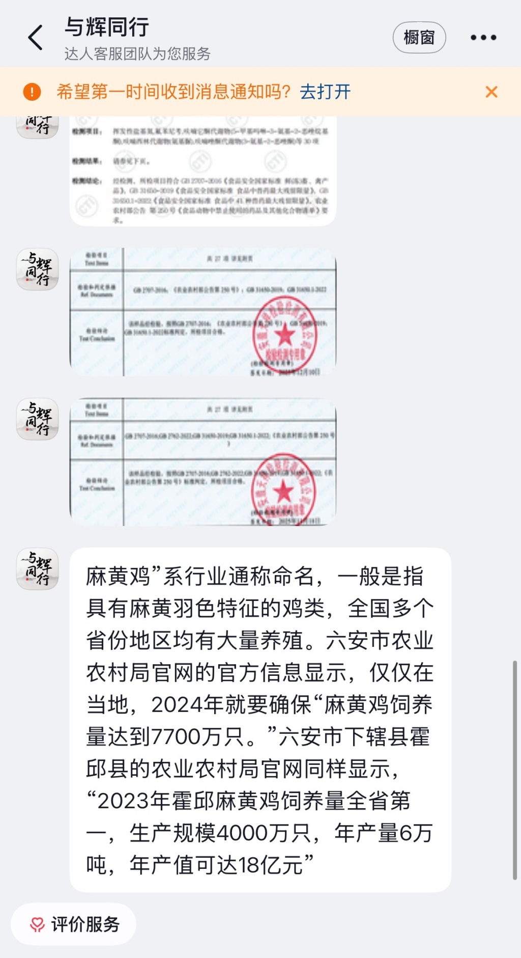 1月15日晚上,澎湃新闻(www.thepaper.cn)再次以消费者身份向“与辉同行”客服咨询所涉争议的产品一事,客服发来三段文字和三张检测报告的结论部分,主要说明了两点:一是所售产品质量合格;二是“麻黄鸡”是行业俗称。