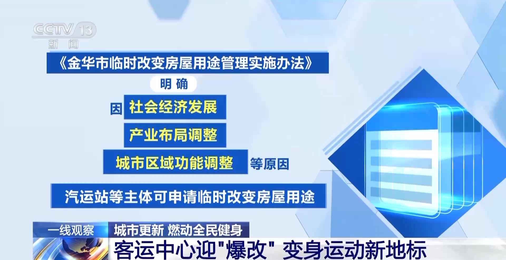 客运中心迎“爆改”变身运动新地标浙江金华市汽车南站占地相当于7个标准足球场大小,曾是区域重要的客运枢纽。随着出行方式的转变,这里的客运业务逐年萎缩,并于2019年全部转移。地处繁华地段,场地却面临闲置,亟待转型。金华市国际陆港集团通济公司工作人员 陈彦杰:确实有很多种产业想进来,像物流、二手车市场,包括幼儿园。我们认为体育产业加上一些商业的这种模式,能够让这个项目持续发展。这一决策的背后,是对民生需求的精准洞察。金华市汽车南站1.5公里范围内有超过100个住宅小区,常住人口近20万,其中六成是年轻人,运动场地的需求尤为突出。然而,业态的转型之路并不是想象中那么简单。汽车站“变身”体育及配套服务业态,需要政府主管部门进行相关手续的变更。金华市缤谷城市运动中心负责人 李龙飞:此前用地性质是交通用地,那么我们现在做体育类的业态,需要商业的性质,场馆才可以使用。为破解城市更新中业态转型难题,金华市出台了临时改变房屋用途管理实施办法,明确因社会经济发展、产业布局调整、城市区域功能调整等原因,汽运站等主体可申请临时改变房屋用途。金华市汽车南站也成为首批受益的城市更新项目。金华市国际陆港集团通济公司工作人员 陈彦杰:办理的这个临时改变房屋用途的协议书。经过改造升级,金华市汽车南站引入20余个运动项目,日均客流量超3000人次。同时,盘活的场地收益还补贴了金华市其他客运站的运营。金华市市民:现在还是这种健康的生活方式需求比较大一点。能利用这么大的一个场地,都是各种健身的场地,挺好的,而且也比较便利。在宁夏银川兴庆区,也有一座长途汽车站成功转型为市民运动场。与金华模式不同,当地创新推出“城际公交”模式。在汽车站大厅外实现“随到随走”的便捷客运服务,既让客运功能得以保留,也让建筑空间成功转型。银川市闽宁文体馆羽毛球项目负责人 陈金才:原来这是一个汽车大厅,因为它有天然的、最好的一种优势,高度15米,这个高度打羽毛球是最通透、最佳的。羽毛球爱好者:我是杭州过来出差,这个旧的场馆能够再利用起来,到这个球馆来打球,感觉非常好。体育设施“以改代建”旧场地“点石成金”随着城市更新的触角不断延伸,除了闲置客运站,老旧厂房、废弃市场等闲置空间也成为更新场景。记者在走访中发现,体育设施“以改代建”已经成为趋势,既降低了建设成本,又精准匹配了群众需求,成为全民健身的热门打卡地。 在北京市房山区拱辰街道,一块“街道体育馆”的门牌格外醒目。每天上午9点,不少银发族就来到这里排队打球。北京市房山区拱辰街道居民:打乒乓球,这是一种习惯,积极向上。“拱辰街道体育馆”建筑面积8000余平方米。原本是一处闲置多年的仓库,在引入社会资本后,华丽转身。挑高超过10米的仓库空间被合理规划,二楼是乒乓球场;一楼预留更高空间打造网球场;在三楼,十多片羽毛球场地能容纳更多人一起运动。北京市房山区拱辰街道居民:报废的仓库进行改造,给居民提供一种运动空间,我真的是没有想到。街道工作人员告诉记者,相较于新建运动馆,旧厂房的改造成本更低,减少了社会资本的运营压力。更重要的是,通过对场馆运营时间的合理分配,也实现了公益属性与市场化运营的平衡。北京市房山区拱辰街道居民:把这种闲置的资产拿出来,服务社会、服务社区,是一个好的范例,而且也值得推广。马鞍山市地处安徽东部,临近苏浙。在马鞍山市经开区,城市更新让闲置的二手车市场迎来“高光时刻”。一处1.3万平方米的大型二手车展厅,被改造成11片国际网球公开赛的标准场地。2025年首次投入使用,就接连举办了多场国际网球赛事。家住杭州的网球运动员王佳祺,每周都会跨省来马鞍山市的这个场馆训练。在长三角一体化发展中,马鞍山市正是利用独特的区位优势,把城市更新和体育赛事经济进行“嫁接”。据记者观察,当地也通过“以改代建”,让资金可以更有效地用在“刀刃上”。马鞍山市住房和城乡建设局城市更新发展服务中心副主任 章小宝:以ROGT网球赛事中心为例,前期投入的6000万元,几乎是90%都用于赛事场地本身的建设,这样就达到了有效资金能够提高赛事标准的目的。2025年,这里累计接待约30个国家、1.8万人次的参赛者和近3万人次的观众,拉动周边消费近2亿元。县城旧砖窑“变身”门球场迎来全运会赛事城市更新不仅是空间与功能的升级,也是城市文化的传承与重塑,体育恰是凝聚城市精神的重要载体。在一线调研中记者发现,一些地方的城市更新还通过激活本地特色运动资源禀赋,让当地因运动而闻名。 新年伊始,在山东省东明县县城的万福公园里,固定的乡镇联谊门球赛如约而至。参赛者平均年龄超过70岁,全县14个乡镇、街道都派出代表队,裁判员、运动员总人数超过100人。据了解,当地常住人口约80万,五分之一是60岁以上的老年人,其中参与门球运动的老年人超过1万人,也被中华全国体育总会授予“全国门球最强县”的称号。菏泽市东明县刘楼镇任庄村村民:全国门球最强县,我们是运动员。当地村民表示,一个季度比赛一次,形成规律、形成制度了。东明县2022年被列入省级城市更新试点。当地将这处废弃瓦窑厂纳入清单,在理清产权关系后进行更新改造,建成了拥有17片标准门球场地的运动公园,