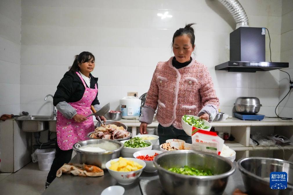 1月20日,巧家县包谷垴乡红石岩村村民钱珍侦(右)在村委会临时安置点帮忙做饭。