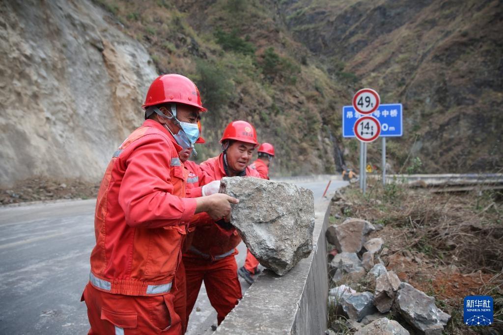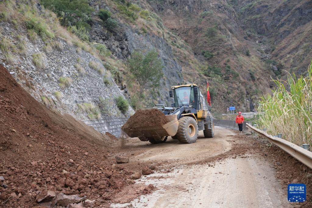 正在进行抢通作业的巧家县境内昭巧二级公路滑坡路段实行单边限制性通行(1月20日摄,无人机照片)。