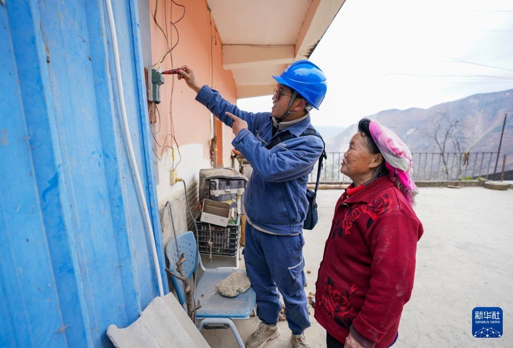 1月20日,南方电网云南昭通巧家供电局工作人员(左)在包谷垴乡红石岩村帮助一户村民检查开关。