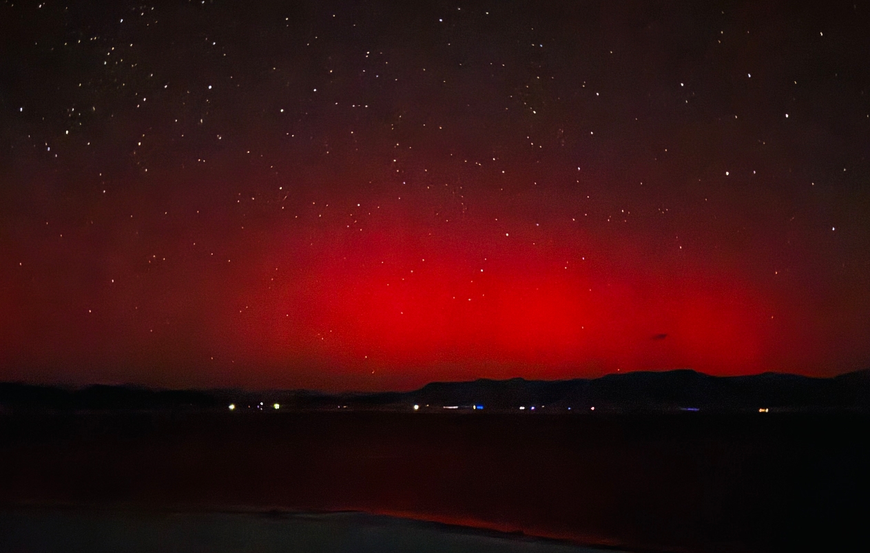“我是刷到有人去看极光,然后也专门深夜出发去蹲,没想到就拍到了。”刘先生说道,大概是在晚上12点之后,极光开始慢慢出现,是红色的,肉眼看可能没那么明显,用手机长曝光才能拍出来。