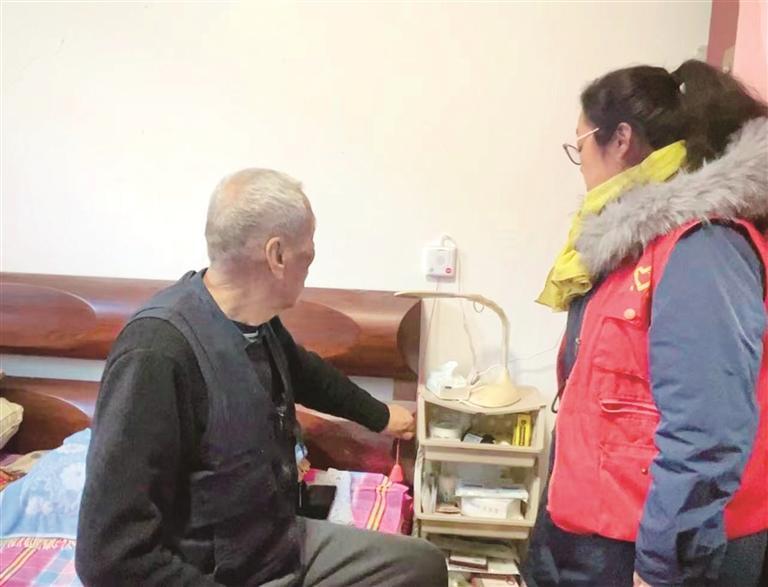 社区专干向独居老人介绍“紧急呼叫器”的用法。