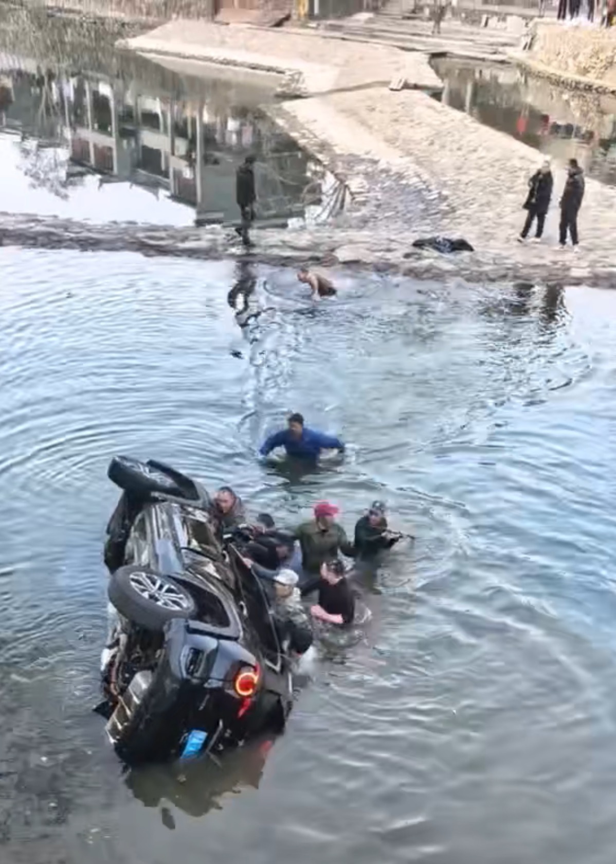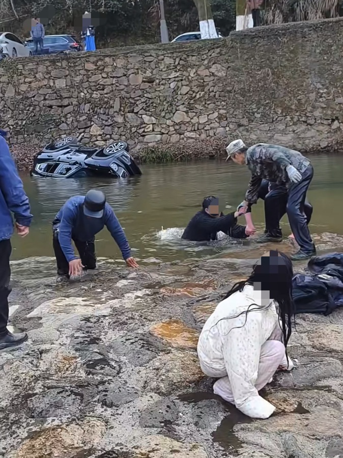 江女士的丈夫何先生是首批施救者之一。他回忆,事发时气温约0℃,河水深一米多,车辆坠河后仰翻在水中,河水已涌入车内。“停车场离河面有3米多高,我和一个年轻游客顺着河坡爬下去,差不多到河边就直接跳进水里救人。”何先生说,由于车窗浸在水中难以敲开,后续赶来的村民合力将车辆侧抬,并用锄头、钢管等工具砸开车窗,将车内4人逐一拖出。“当时有人已经失去意识,好在抢救及时,并无大碍。”