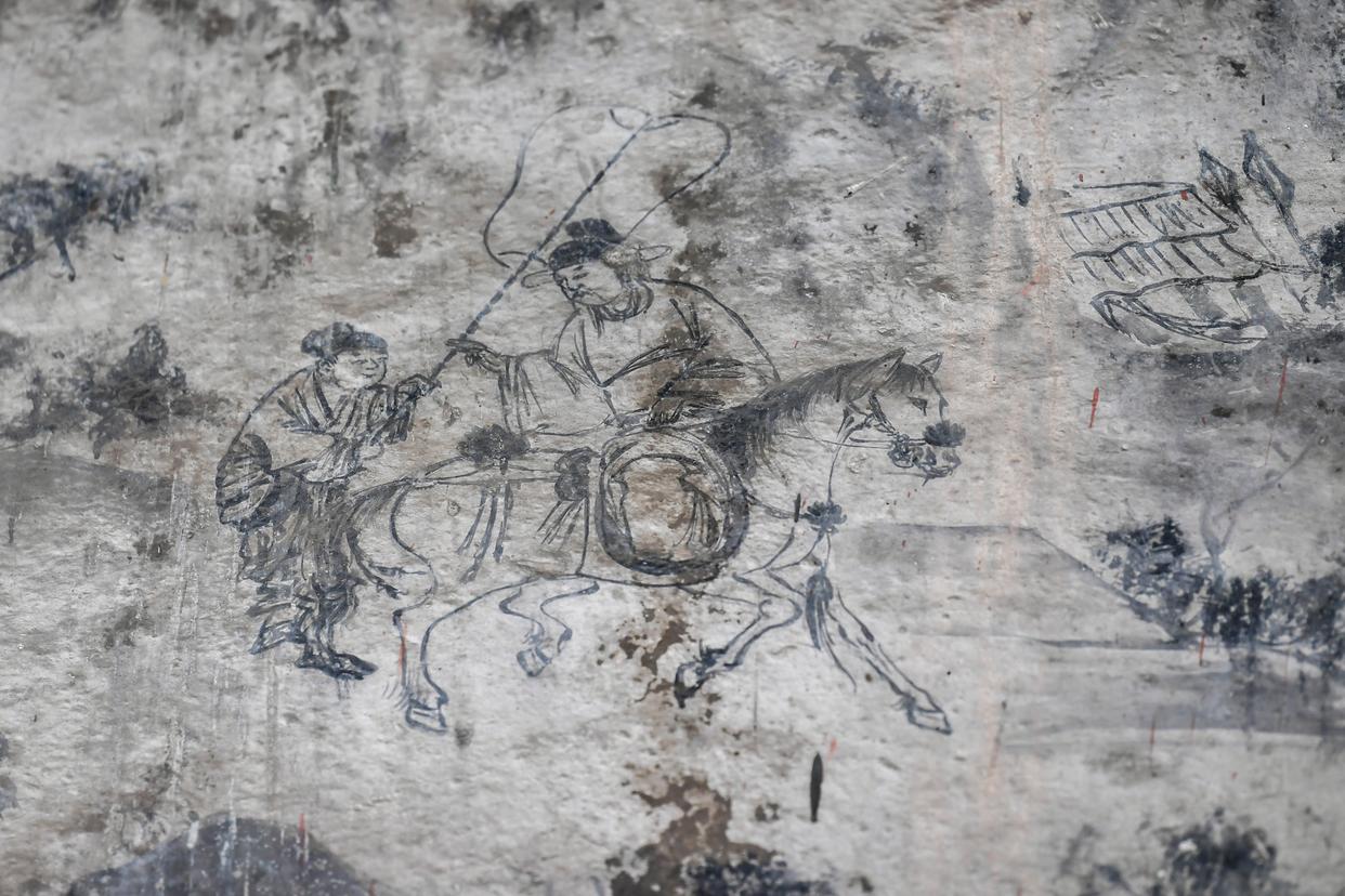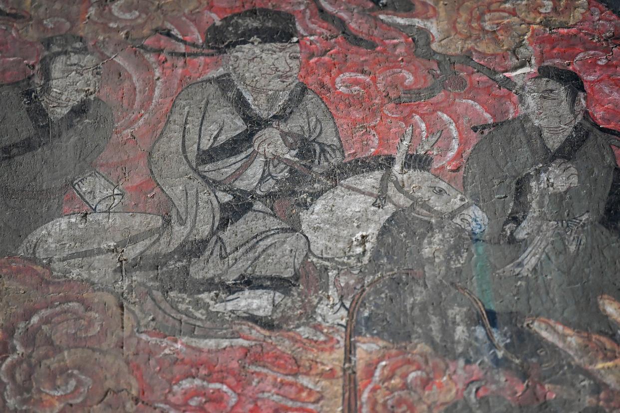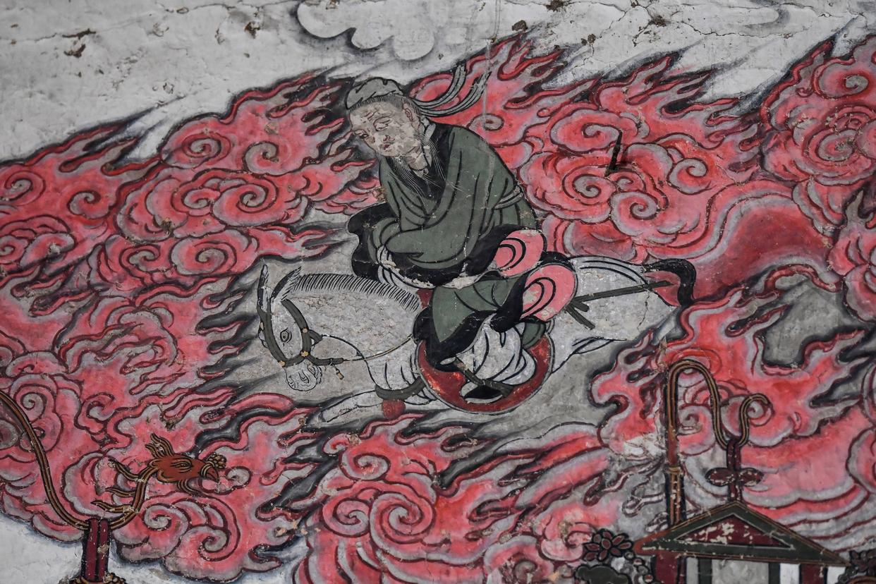 这是在山西省高平市仙翁庙拍摄的壁画中的马。古代匠人将马的形象