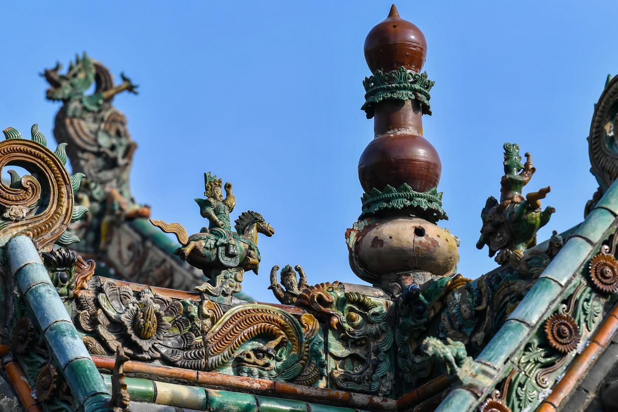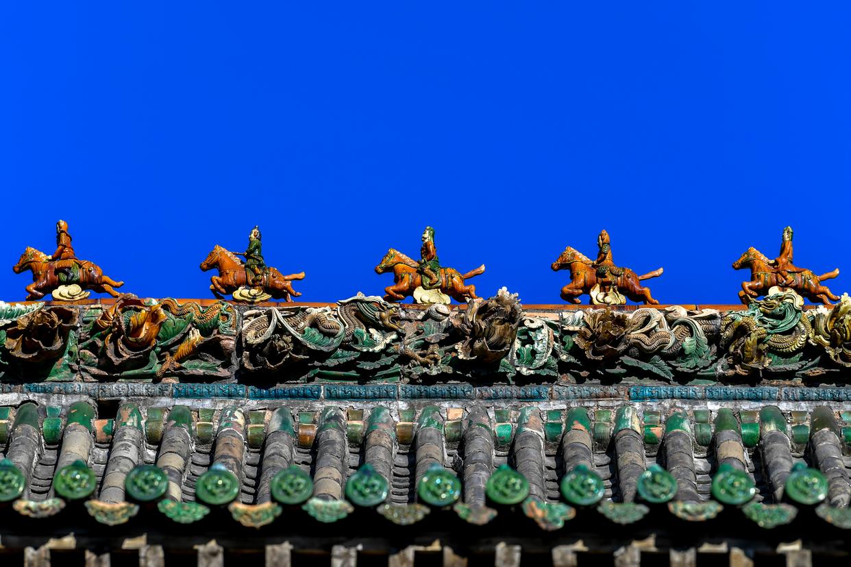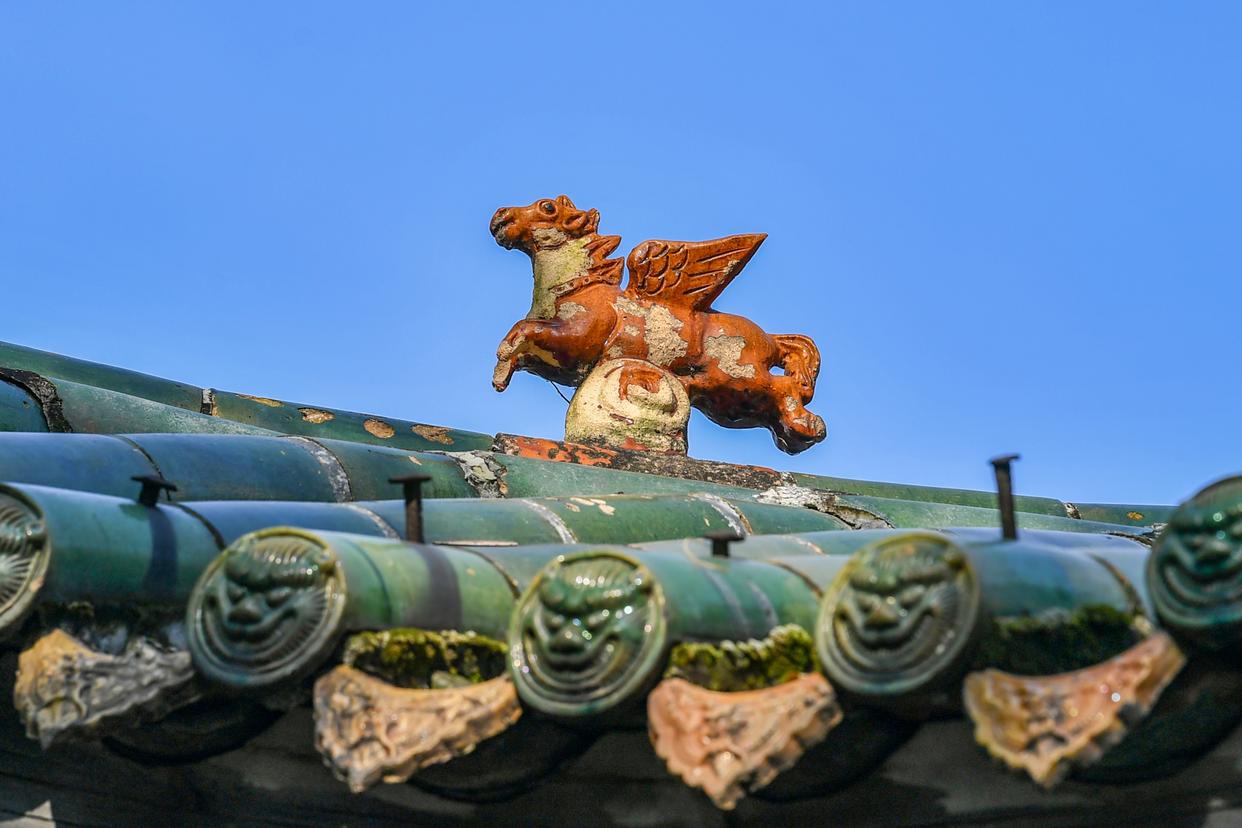 这是在山西省运城市关帝庙拍摄的古建顶上的飞马造型装饰构件。自古以来