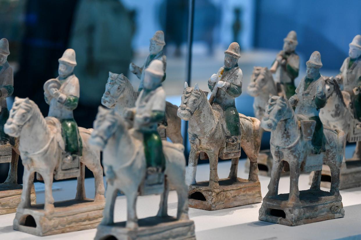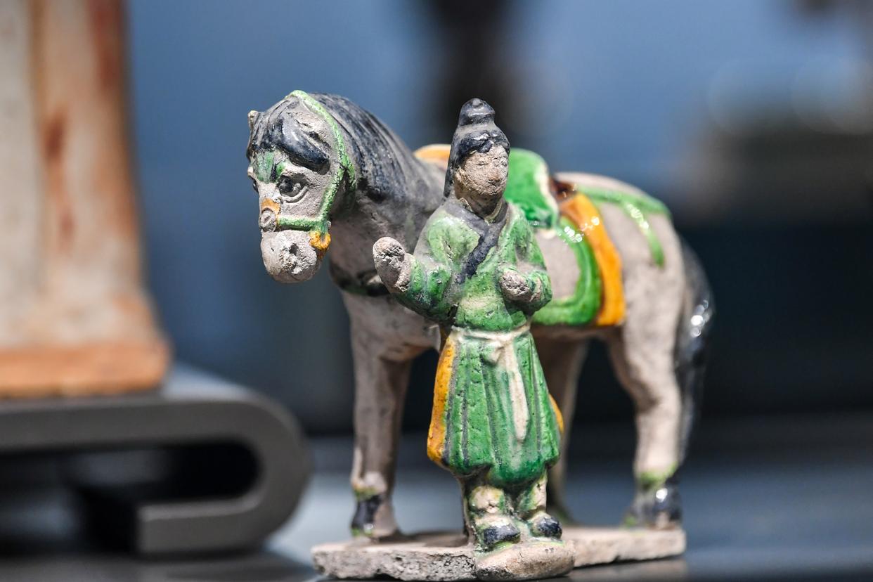 这是在山西省长治市博物馆拍摄的绿釉骑马琉璃仪仗俑。