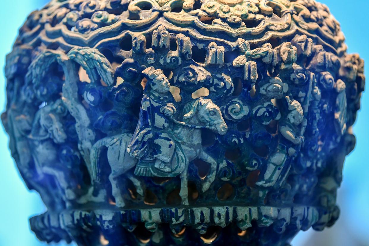这是在山西省长治市博物馆拍摄的镂空堆塑人物故事珐华罐。