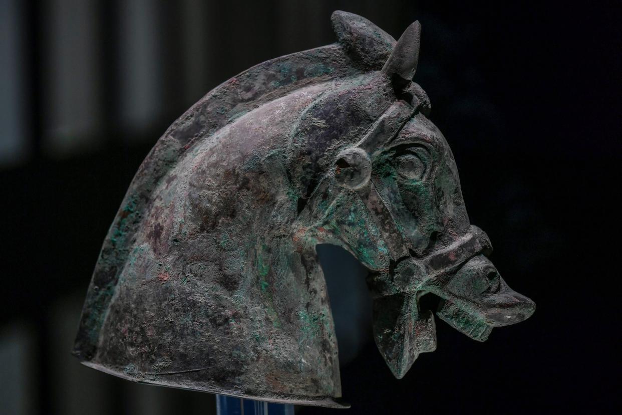 这是在山西省临汾市博物馆拍摄的战国时期的铜马首。