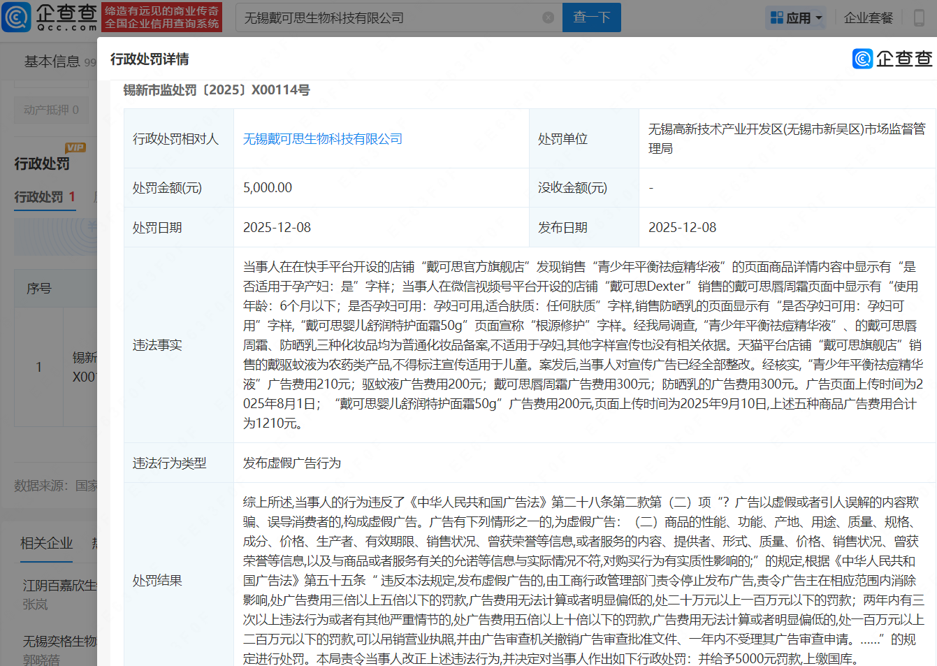 企查查APP显示,该品牌关联的无锡戴可思生物科技有限公司成立于2017年6月,法定代表人张晓军,注册资本约376万元,经营范围包含母婴用品制造、母婴用品销售、化妆品批发等,由张晓军、祥峰(厦门)投资合伙企业(有限合伙)等共同持股。2025年12月,该公司因发布虚假广告行为被当地市场监督管理局罚款5000元,其多款普通备案化妆品违规标注孕妇可用,部分产品宣传无相关依据。此外,该公司涉多起司法纠纷,案由包括产品责任纠纷、合同纠纷等。