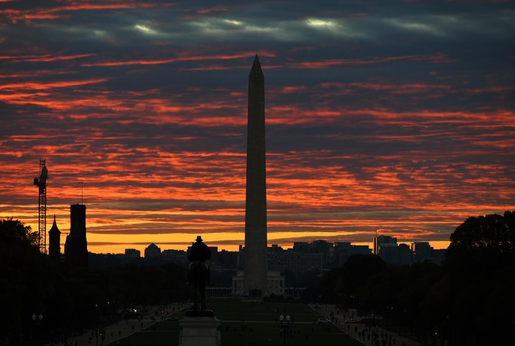 这是2025年10月15日拍摄的日落时分的美国华盛顿纪念碑。新华社记者李睿摄