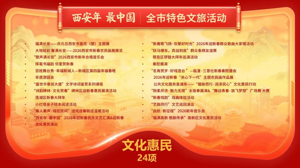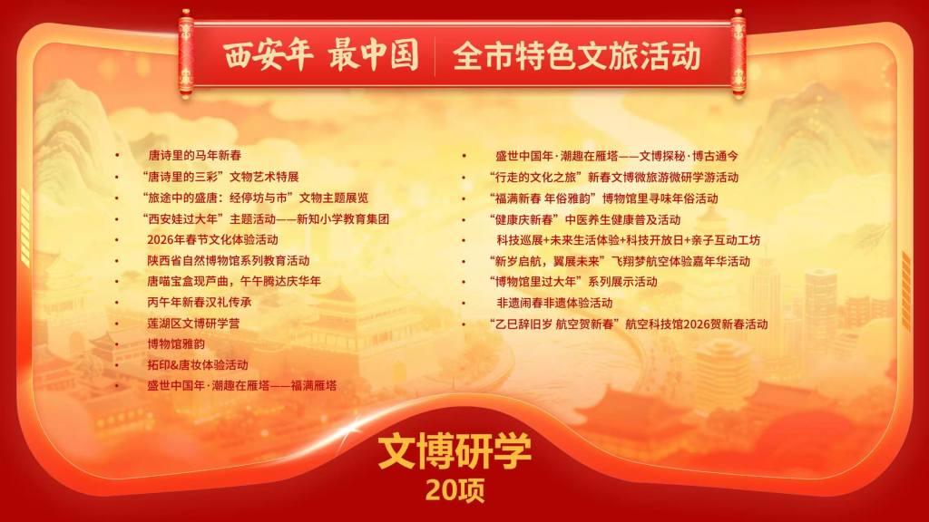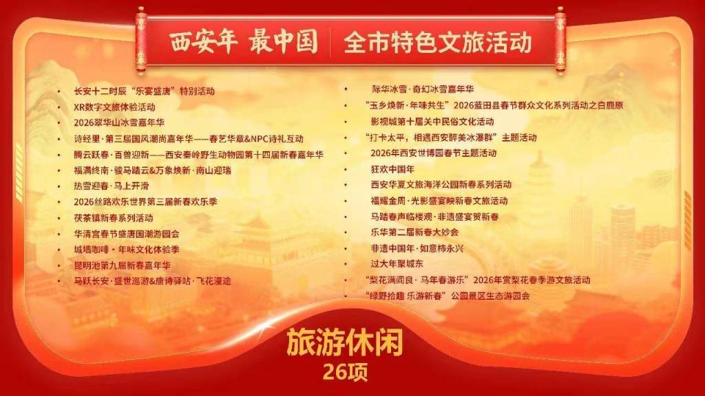 与此同时,“西安年·最中国——数享西安年”2026年西安市新春文旅系列活动自1月起,将持续至3月18日(农历正月三十),通过打造“1+6+5+N”的丰富内容体系,为市民游客呈现一场“可观、可感、可沉浸、可带走”的数字中国年。