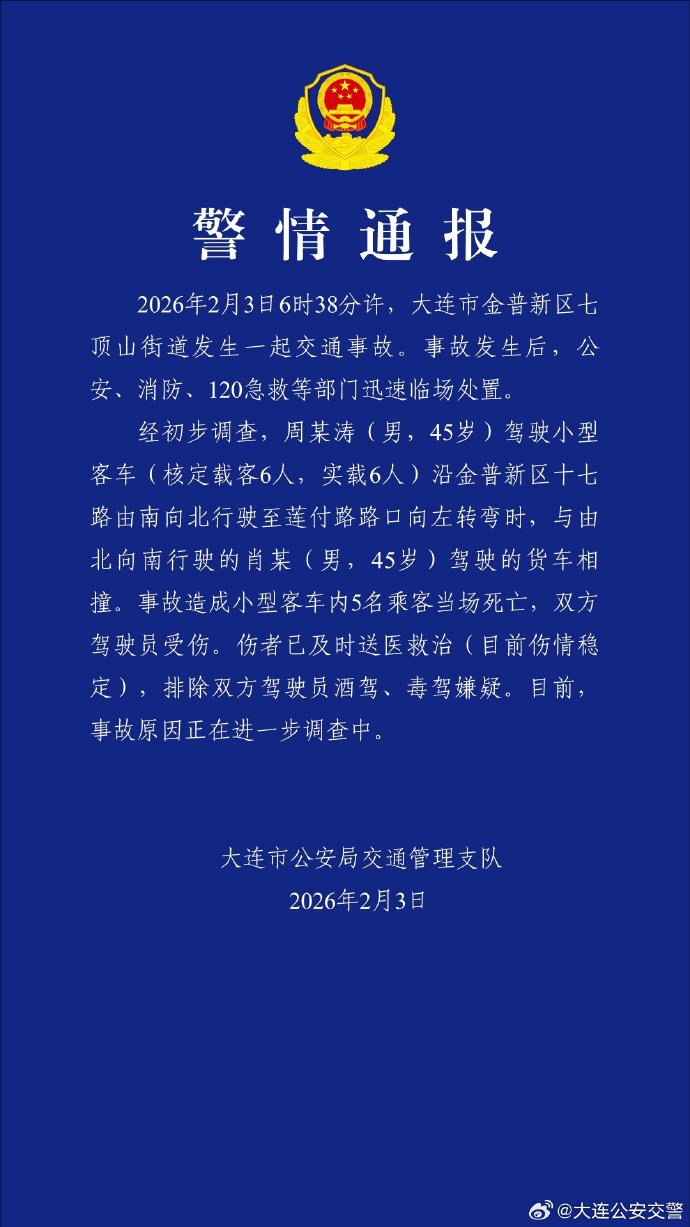 大连市公安局交通管理支队发布警情通报:2026年2月3日6时38分许,大连市金普新区七顶山街道发生一起交通事故。事故发生后,公安、消防、120急救等部门迅速临场处置。